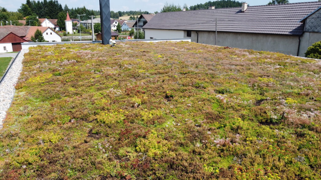 Na nové střešní konstrukci je extenzivní zelená střecha, která zlepšuje tepelnou ochranu, prodlužuje životnost hydroizolace a snižuje letní přehřívání objektu. Studie měřením prokazují snížení teploty na hydroizolaci o desítky stupňů v létě a izolační přínos v zimě, což podporuje úspory na vytápění i chlazení a redukuje efekt tepelného ostrova. Zelené střechy navíc zadržují srážkovou vodu, zlepšují kvalitu ovzduší a posilují biodiverzitu, pokud je zvolena vhodná skladba a údržba.
