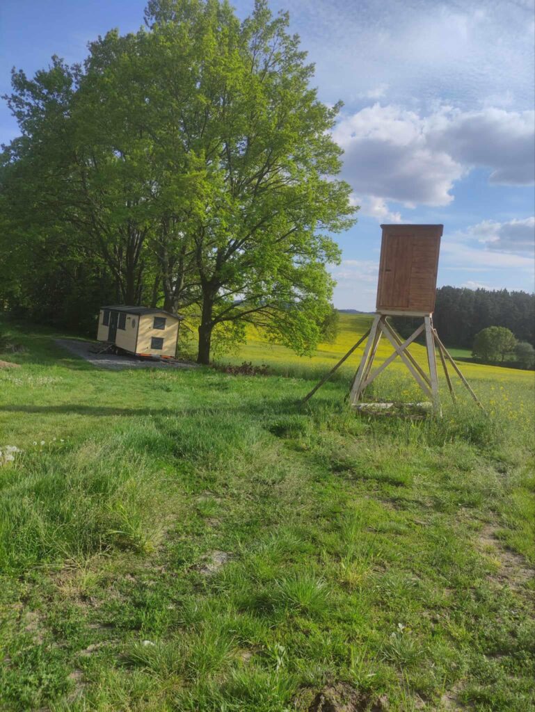 Hygienické zázemí doplňuje chemické WC s připravenou možností budoucího napojení na standardní kanalizační systém. Interiér maringotky vznikl ve spolupráci s obcí, vedoucím kroužku i dětmi, které se podílely na návrhu vybavení tak, aby bylo dost místa na myslivecký materiál, výukové pomůcky i přespání. Celý prostor u lesa doplnil nový krmelec a kazatelna, takže vzniklo ucelené venkovní učební prostředí propojující klubovnu, krajinu a praktickou péči o zvěř i les.