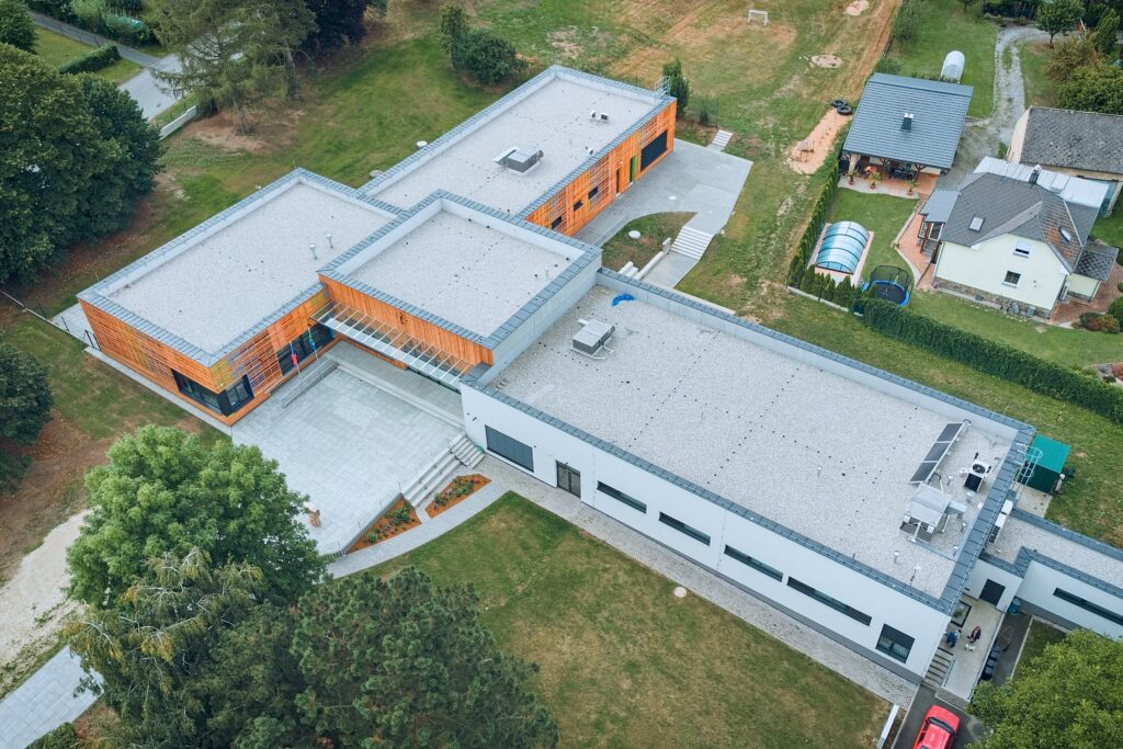 Obnova základní školy v Postřekově představuje spojení moderních technologií, efektivní energetiky i hluboce zakořeněných místních tradic. Komplexní zateplení obvodových stěn, střechy a podlah spolu s instalací špičkových oken s trojsklem (Uw=0,8W/m²K) a s větracím systémem s rekuperací tepla zajistilo, že budova splňuje přísné požadavky na energetickou úspornost. Díky důslednému utěsnění obálky školy, novým šatnám, bezbariérovému přístupu a dalším provozním úpravám se výrazně snížily náklady na vytápění, provoz i údržbu. Škola tak nabízí bezpečné, zdravé a úsporné prostředí pro více než stovku žáků a tým pedagogů.