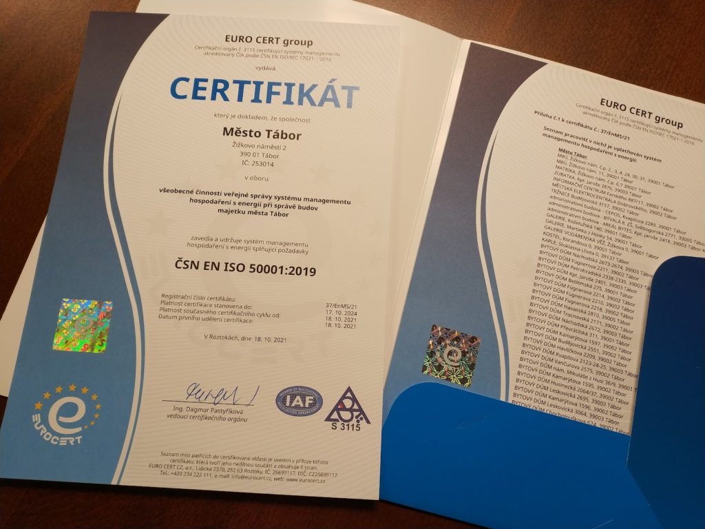 Tábor za špičkově zpracovanou strategii energetického managementu, úspěšně ústící v certifikaci dle normy ISO 50001 (jako první v ČR u příspěvkové organizace). Na základě kvalitního energetického managementu realizuje Tábor další kroky v energetice, které má díky tomu velmi dobře podloženy měřnými údaji.