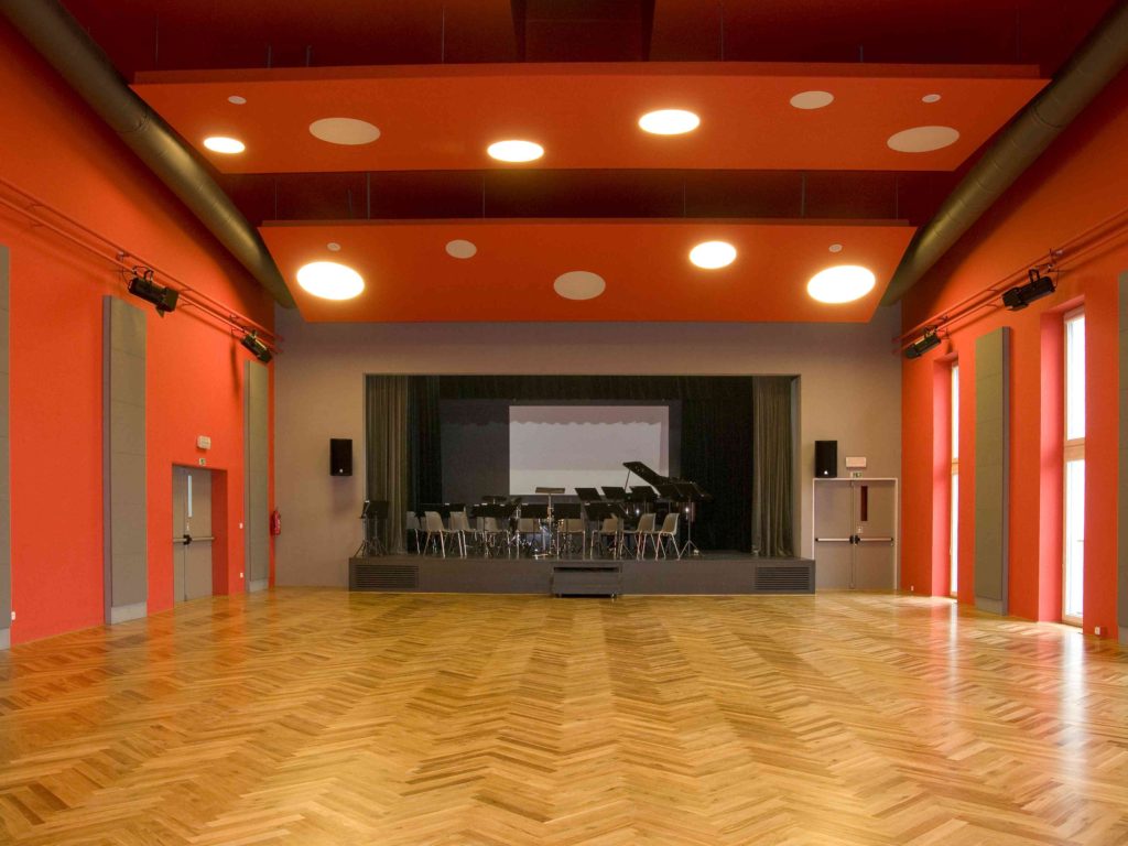 V první vestavbě krovu jsou galerie sálu a kavárna s vyhlídkovým balkonem. Pro výraz i provoz školy jsoun důležitými velkorysé foyer ve všech podlažích s plastikou od světoznámého rodáka, výtvarníka Karla Malicha. Další plastika tohoto umělce je umístěna na průčelí budovy.