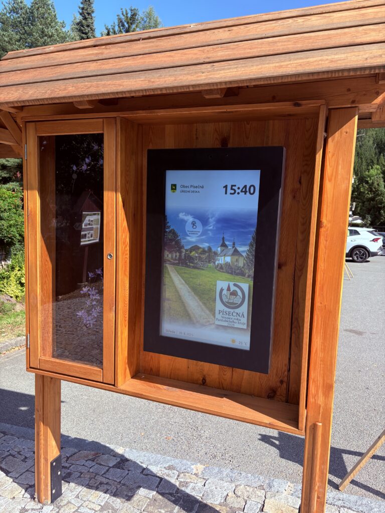 Konečně i moderní technologie začleňuje obec Písečná do života citlivě, s respektem k venkovskému rázu. Například elektronická úřední deska je ukrytá v dřevěné vývěsce, takže neruší malebnou náves a zároveň přináší moderní komfort.