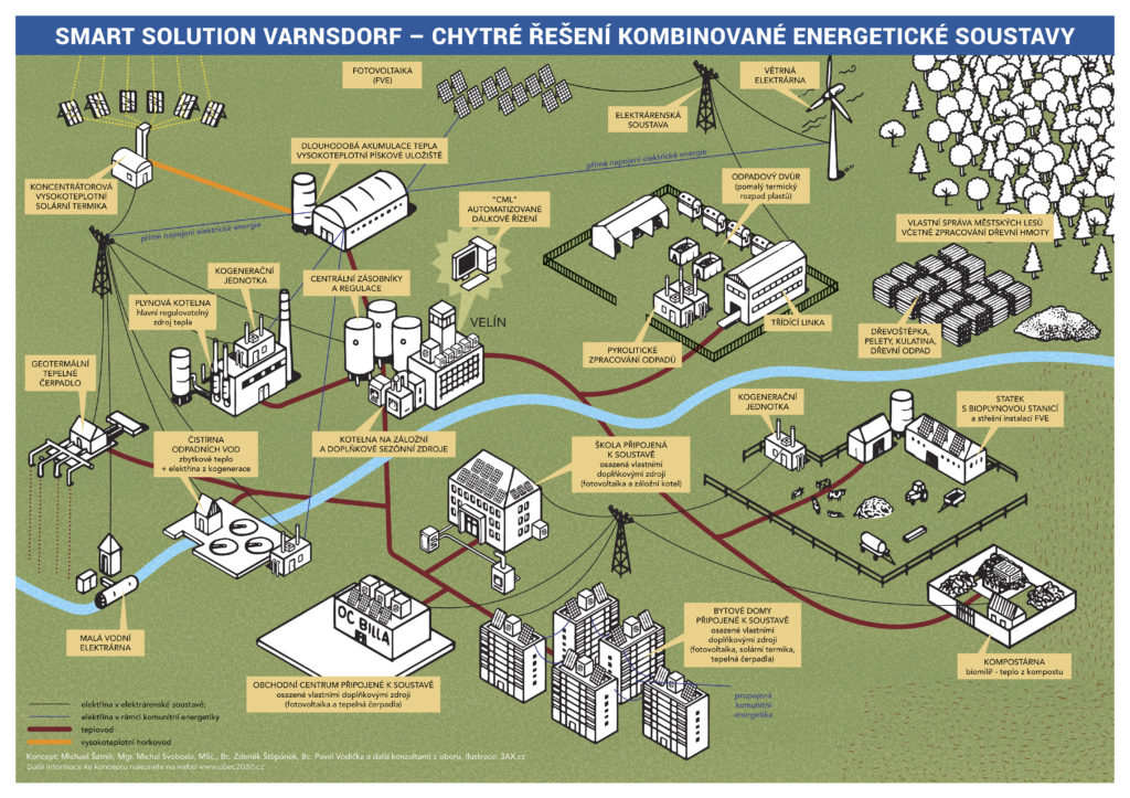 Druhým klíčovým prvkem Varnsdorfského Smart Solution Varnsdorf je kombinace zdrojů výroby energií. Nepočítá se s nahrazením jednoho centrálního zdroje jiným (byť třeba ekologičtějším), nýbrž o kombinaci vícero zdrojů. Může jimi být slunce, voda, vítr, biomasa, ale i energie zemského jádra nebo (last but not least) odpad. To má následující důvody: